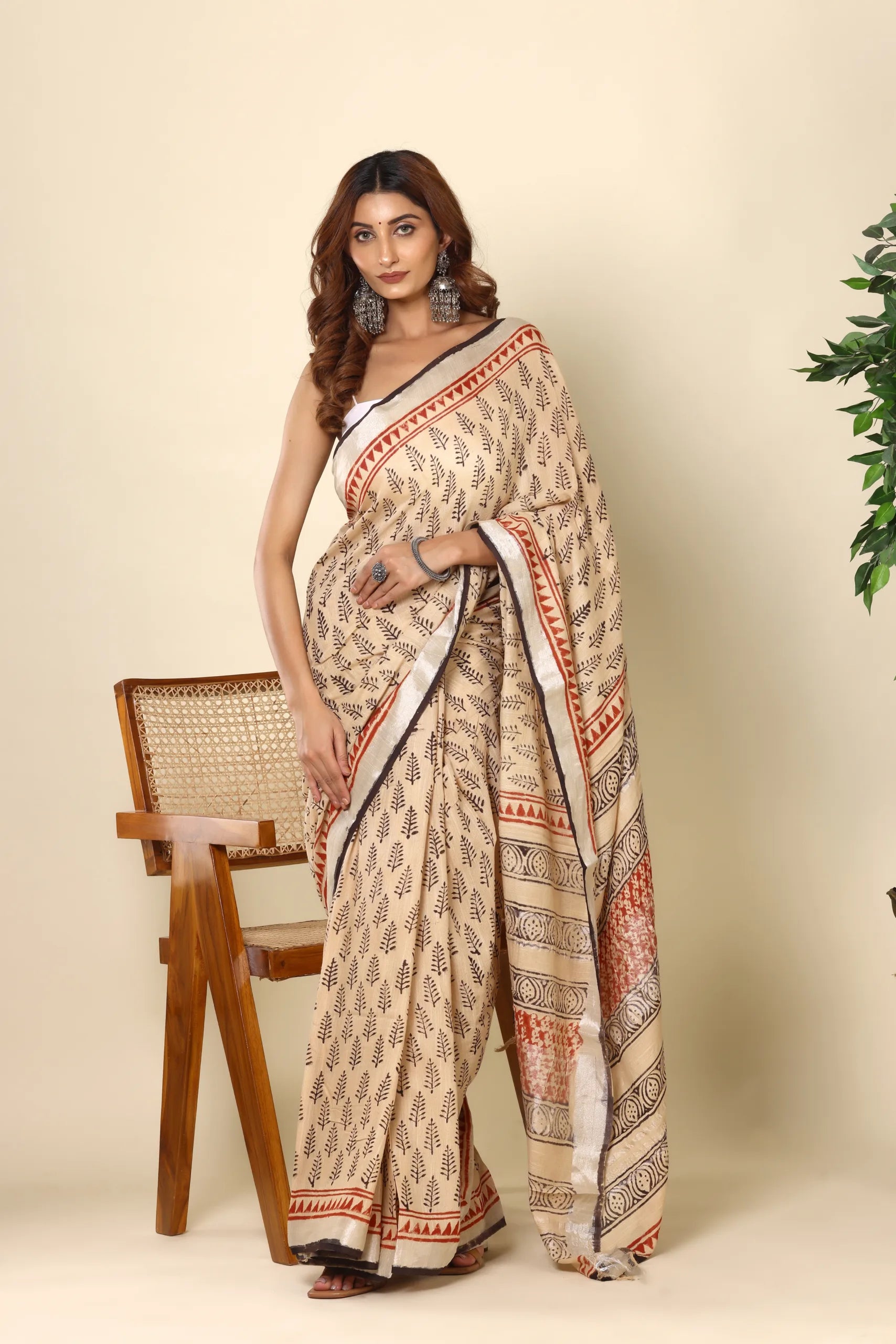This elegant beige linen saree features tribal-inspired block prints and an earthy color palette. Accented with rust, black, and white geometric borders, it's perfect for cultural gatherings, offic...