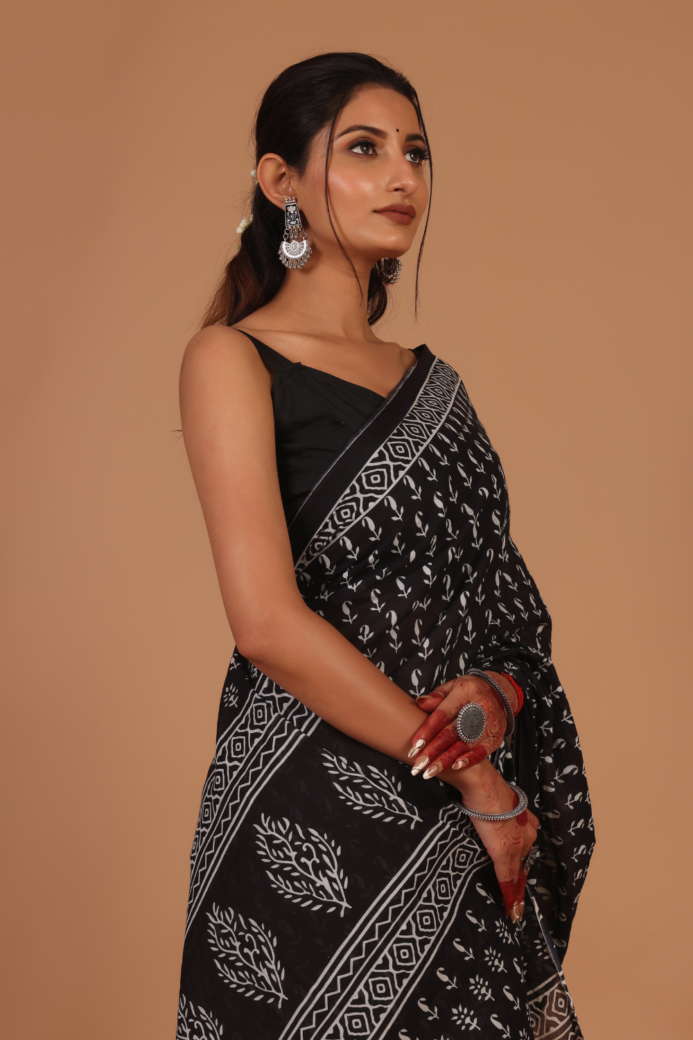 Classic Black Base Saree with White Traditional Prints – Timeless Elegance