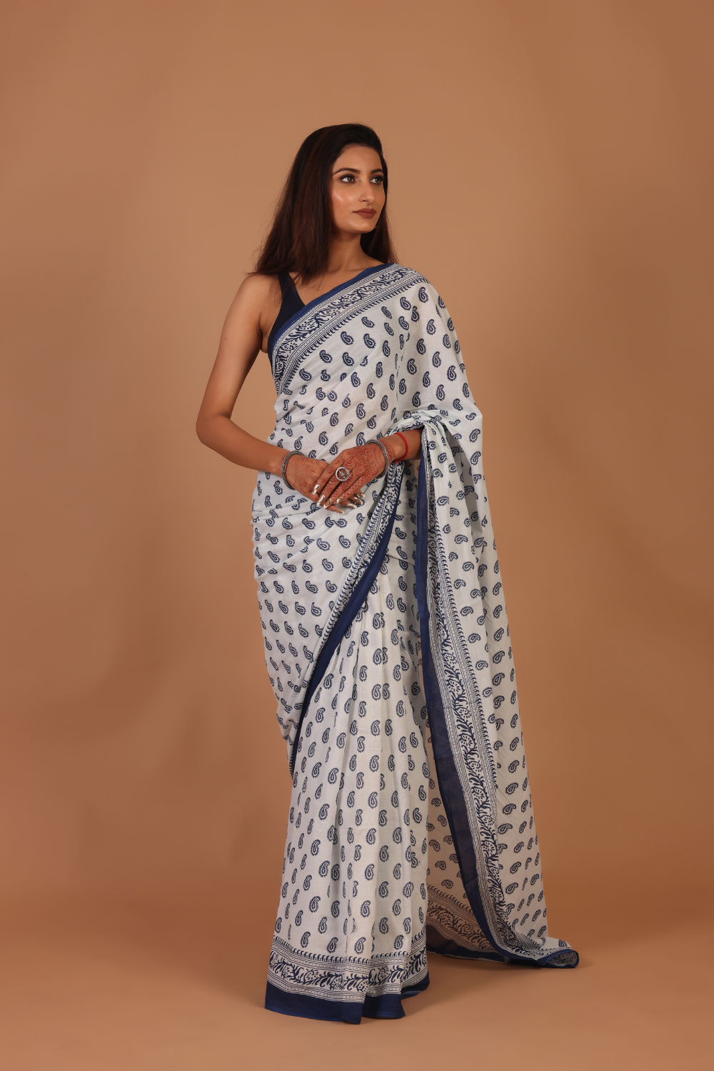 Discover the beauty of tradition with this elegant white saree, featuring intricate blue traditional prints that adorn the fabric all over. The vibrant black designs create a striking contrast with...