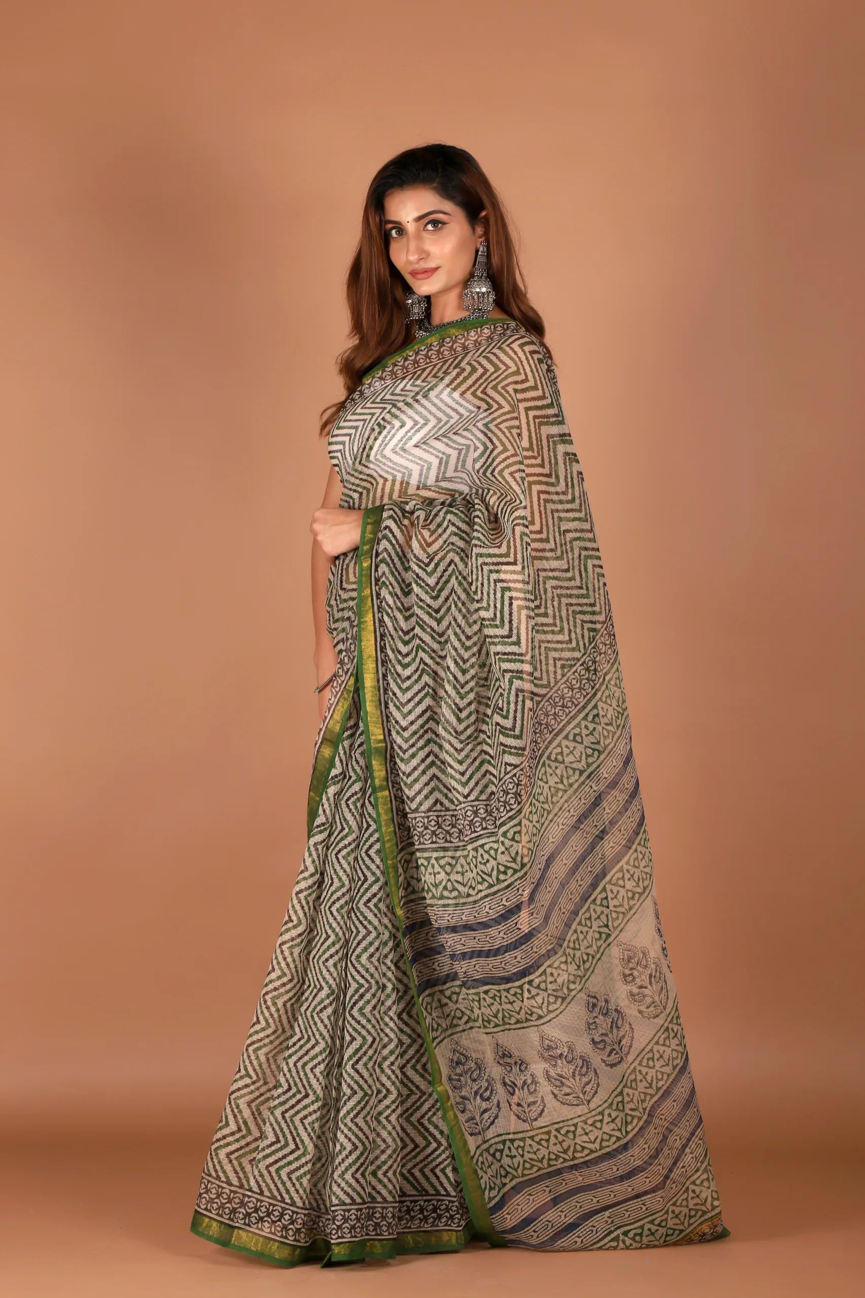 Elevate your everyday grace with this handcrafted Kota Doria saree, featuring rhythmic chevron patterns in earthy tones accented by a vibrant green zari border. The intricate design flows across th...