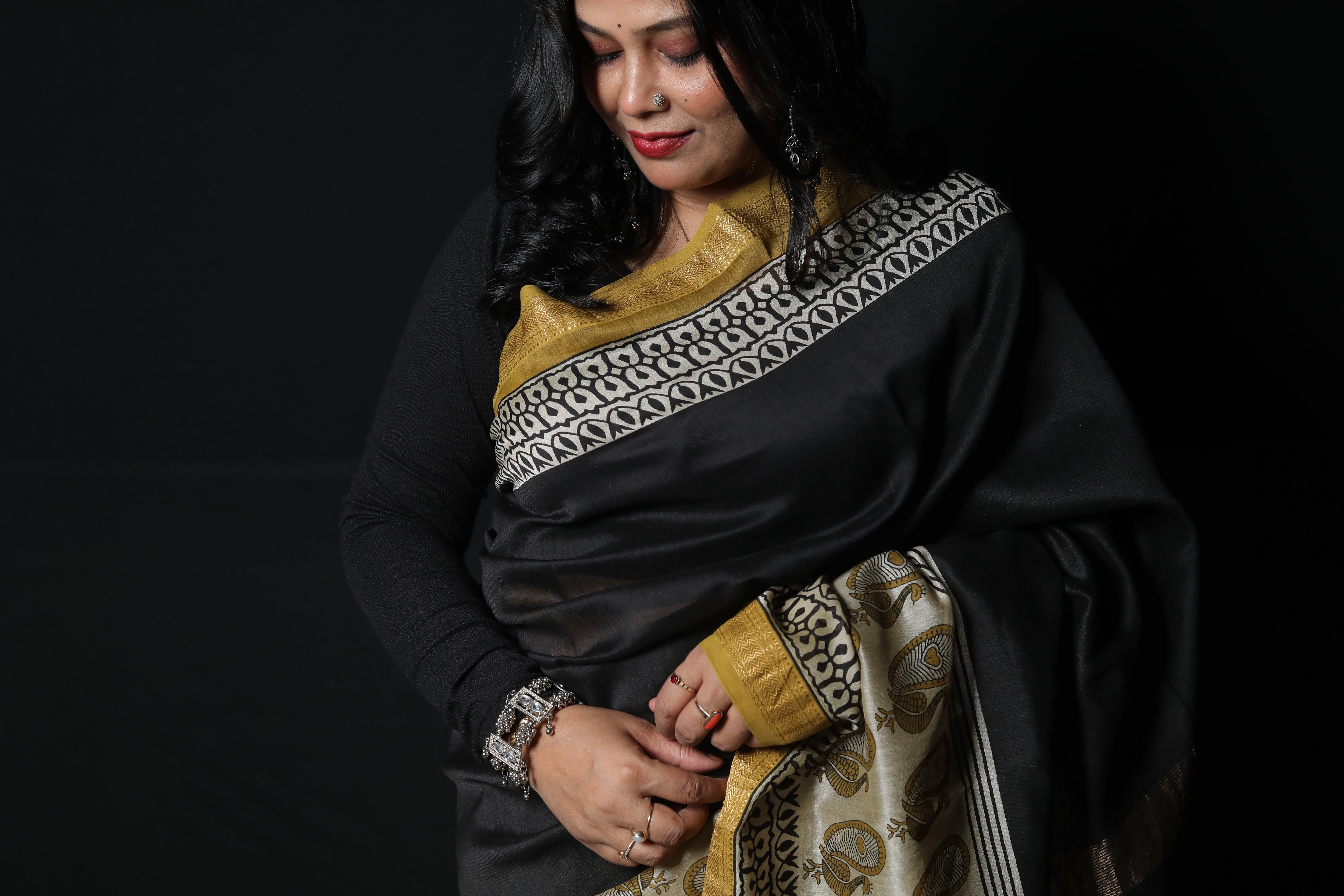 • Color: A sophisticated Midnight Black base contrasted with Cream/Ivory block prints and a signature Golden Zari border.