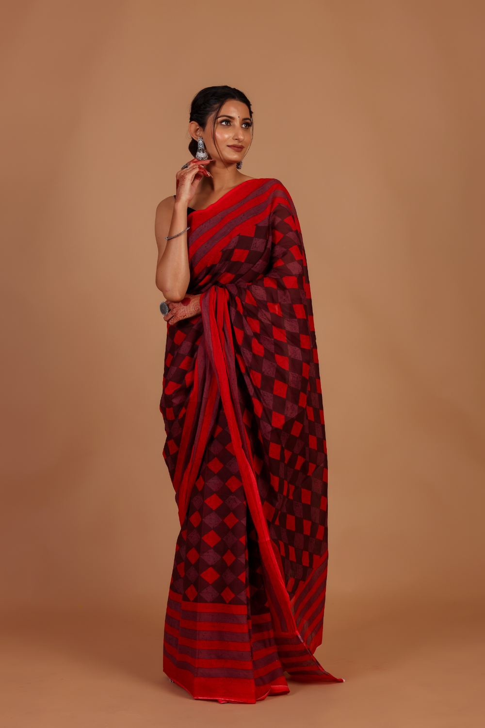 This bold and stylish red cotton saree features a striking geometric pattern in shades of deep red and black. The contrasting red border adds a vibrant touch, while the lightweight, breathable cott...