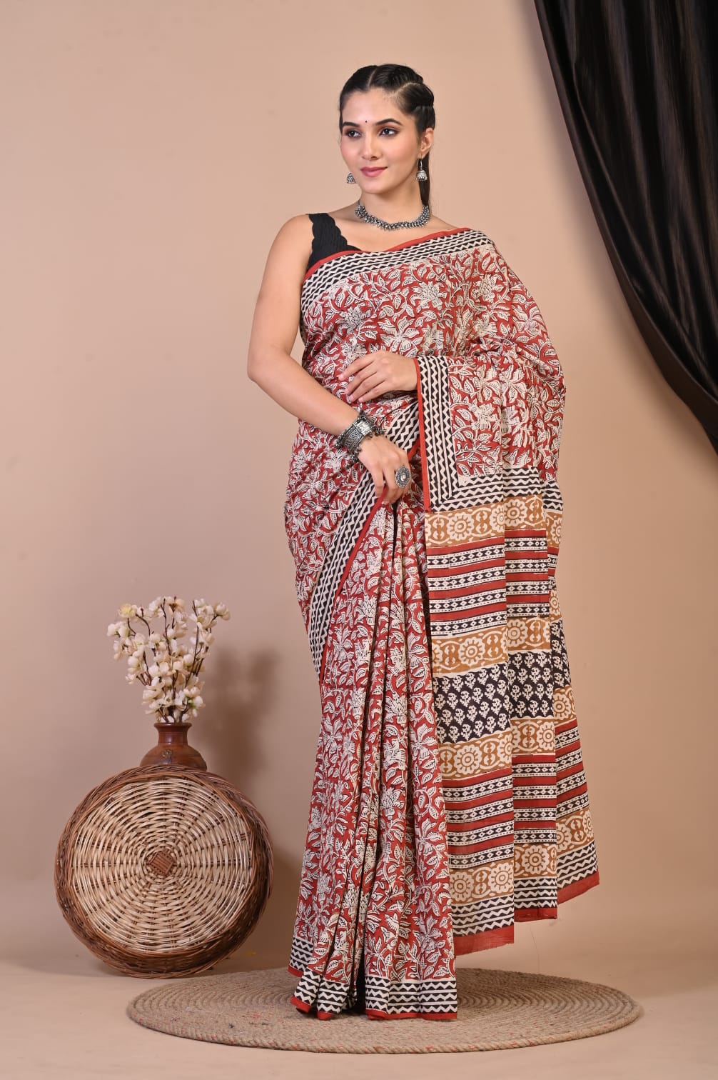 Step into elegance with this exquisitely crafted handblock printed cotton saree, featuring a rich blend of traditional motifs and earthy tones. The rustic red base...