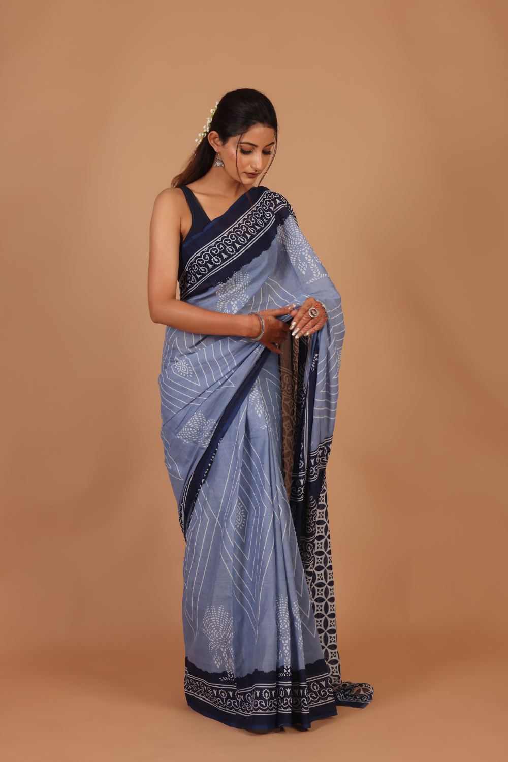 Step into sophistication with this stunning saree, featuring a soft stone gray base that sets the perfect backdrop for modern elegance. The saree showcases dark blue corners, adding a rich contrast...