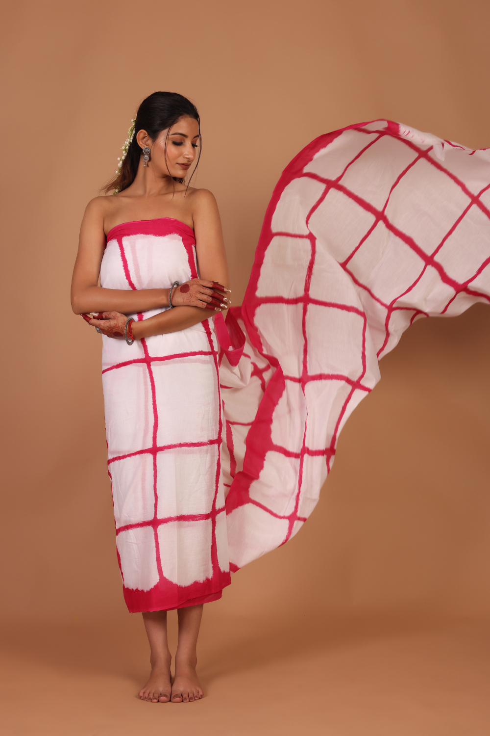 Elegant White Base Saree with Magenta Square Pattern – A Touch of Tradition